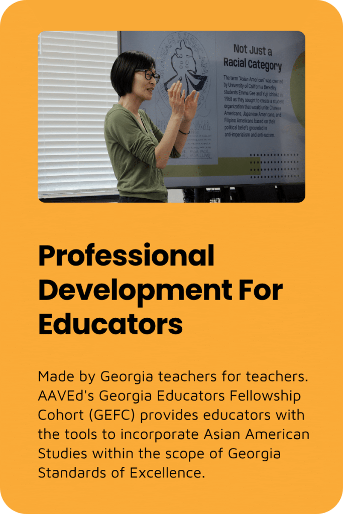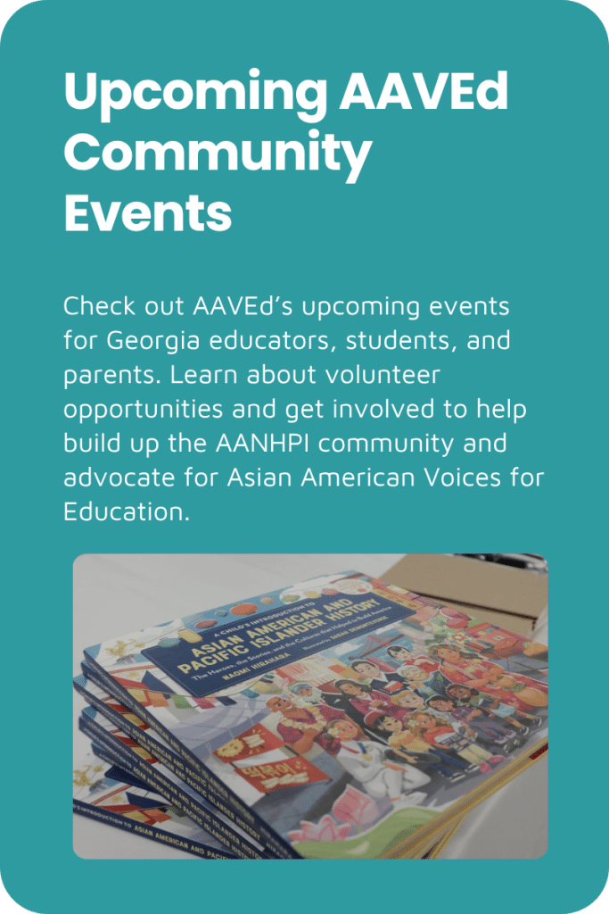 Here in Georgia, AAVEd is developing resources specifically aligned with the GA Department of Education Standards of Excellence. These will show how Asian American history is woven together with the histories of all people in the United States. We look forward to sharing these with you in Fall of 2023!