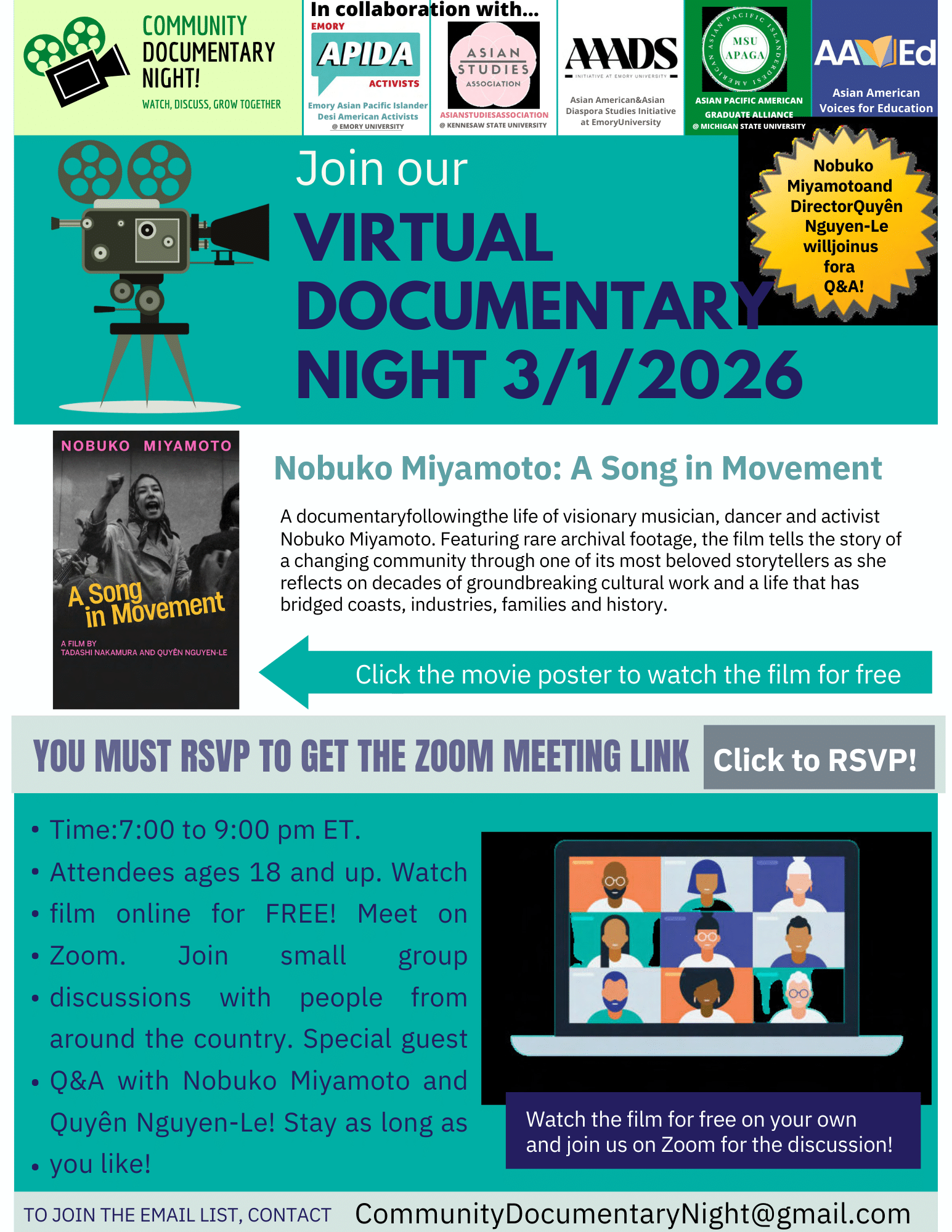 For this Special Virtual Documentary Night, in honor of Women’s History Month, we are meeting to talk about the documentary, Nobuko Miyamoto: A Song in Movement. A documentary following the life of visionary musician, dancer and activist Nobuko Miyamoto. Featuring rare archival footage, the film tells the story of a changing community through one of its most beloved storytellers as she reflects on decades of groundbreaking cultural work and a life that has bridged coasts, industries, families and history. Quyên Nguyen-Le and Nobuko Miyamoto will be joining us for a special guest Q&A!